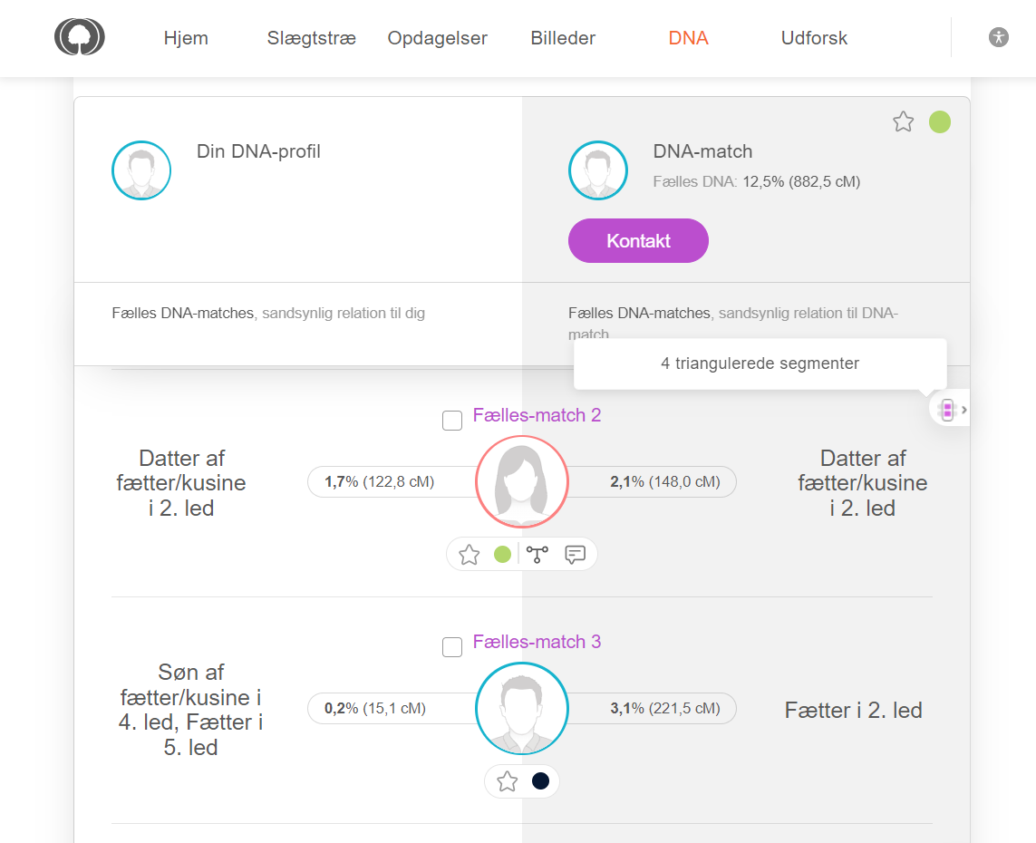 I illustrationen ovenfor ses ude til højre et lille ikon med striber, som viser, at ”Din DNA-profl”, ”DNA-match” og ”Fælles-match 2” har DNA, som deles på tværs af alle tre personer. Ved at holde musen henover ikonet vises, at der er 4 triangulerede segmenter af DNA.