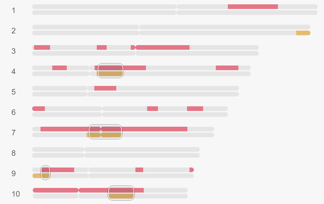 Hvis man klikker på ikonet for trianguleret DNA, får man vist en oversigt, der viser præcis hvilke segmenter på hvilke kromosomer de tre match har fælles. Nedenfor ses, at der er segmenter på 4., 7., 9. og 10. kromosom, som er fuldstændige identiske på tværs af de tre personer.