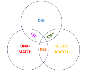 Forestil dig, at du og DNA-match har fælles slægt på Fyn. I har så et fælles-match, som er beslægtet med dig via slægts på Møn, mens fælles-match er beslægtet med DNA-matchet via slægt i København.